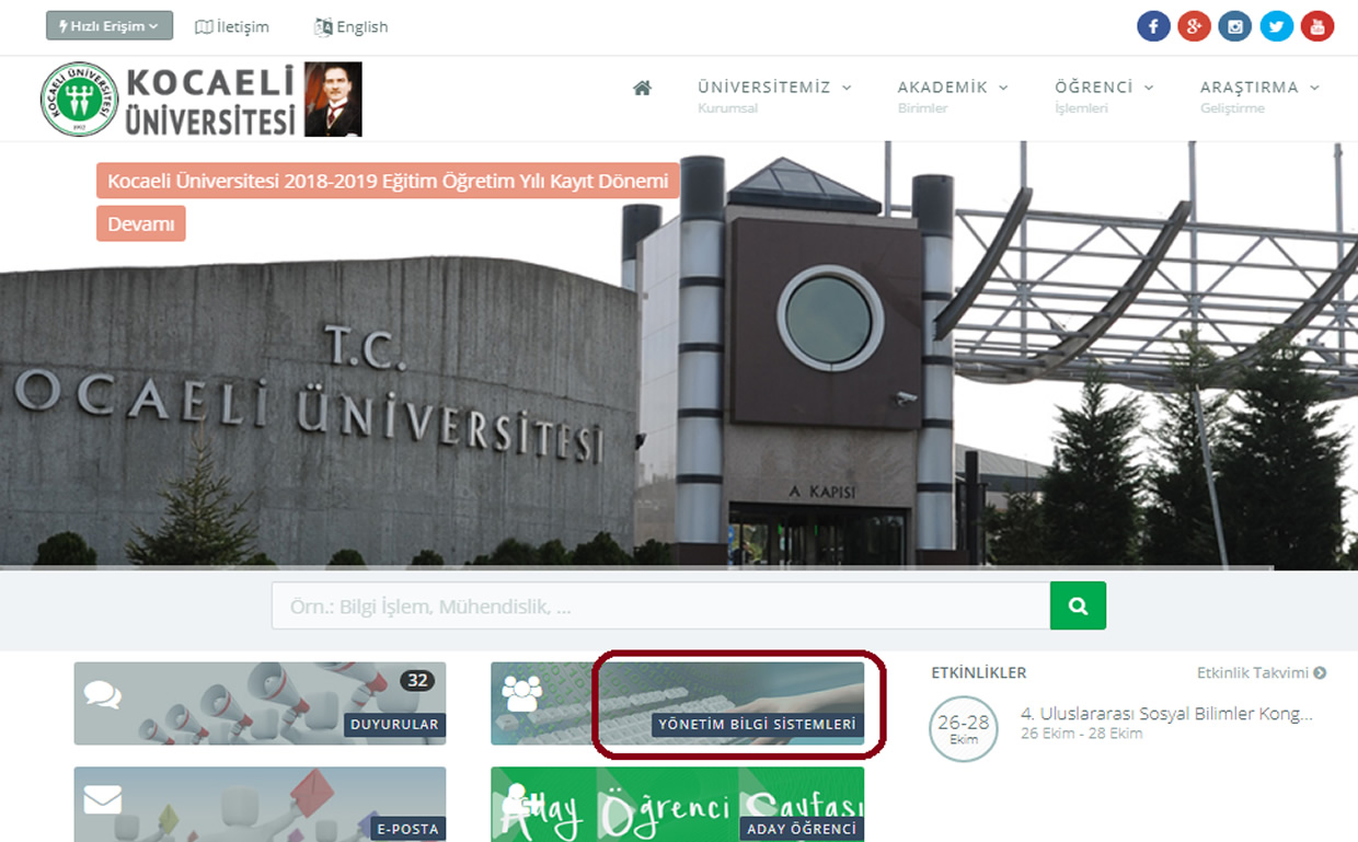 - . www.kocaeli.edu.tr sitesine giriniz. Gelen sayfadan "YÖNETİM BİLGİ SİSTEMLERİ" butonunu tıklayınız.