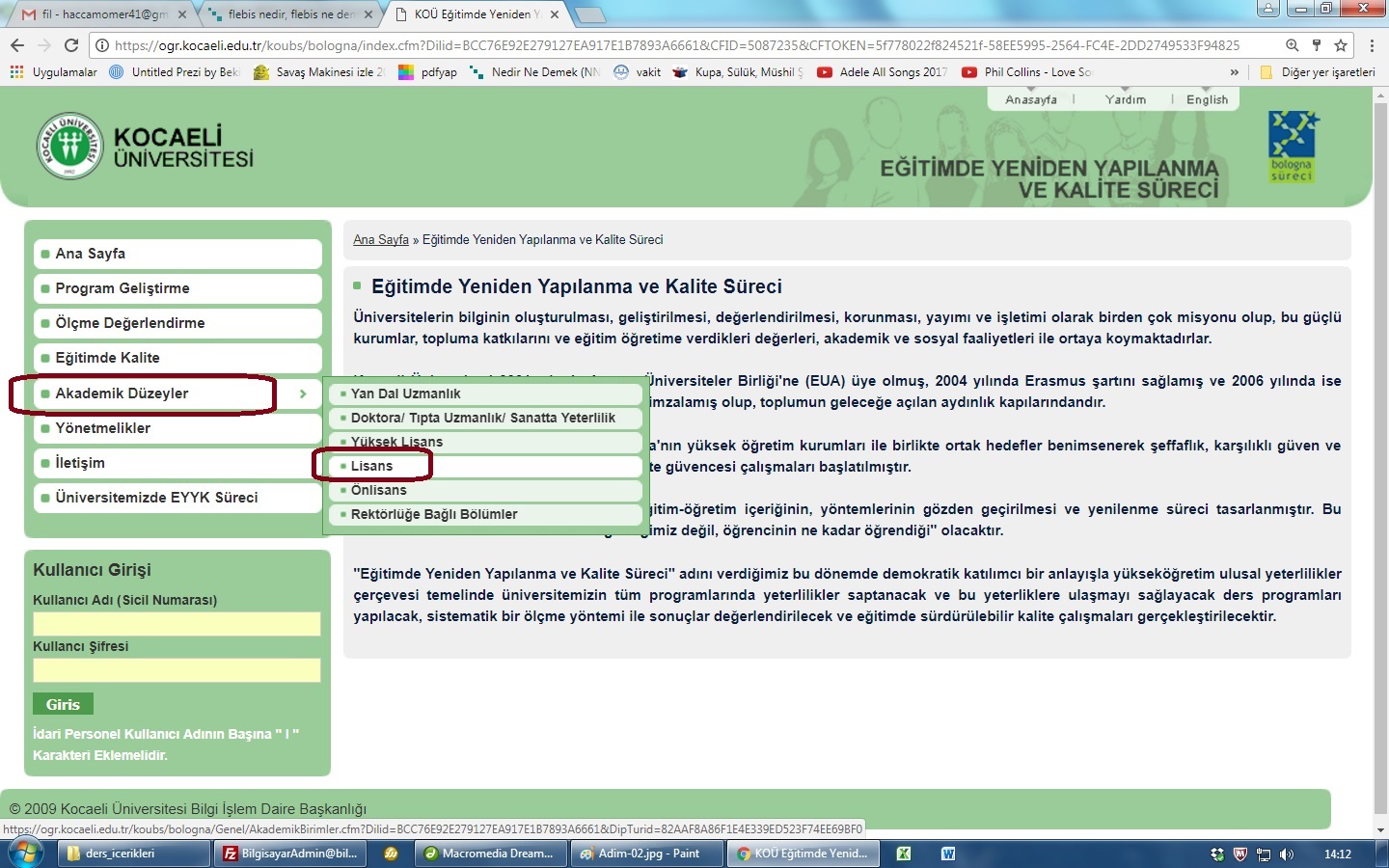 - . Gelen ekranda soldaki menüden "Akademik Düzeyler" den "Lisans" menüsünü seçiniz.