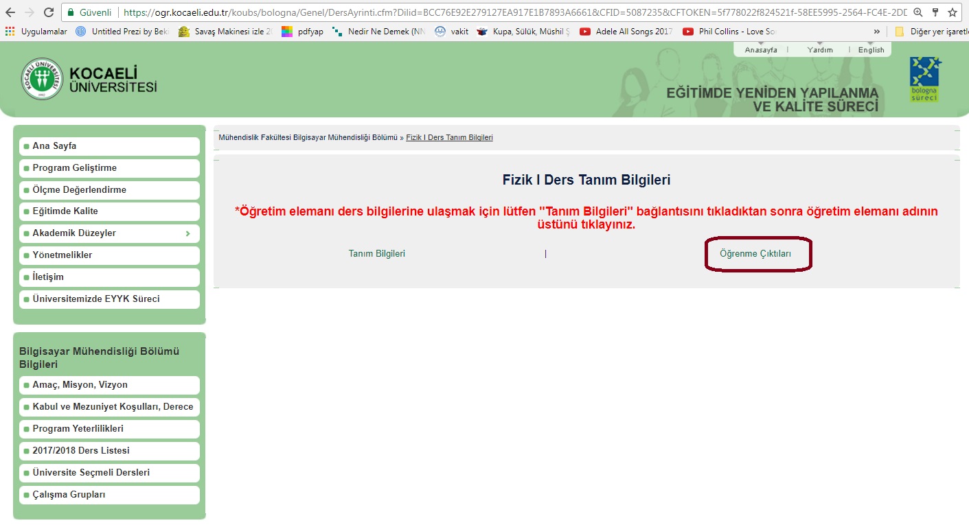 - . Sağ taraftan "Öğrenme Çıktıları" na ulaşılabilir.