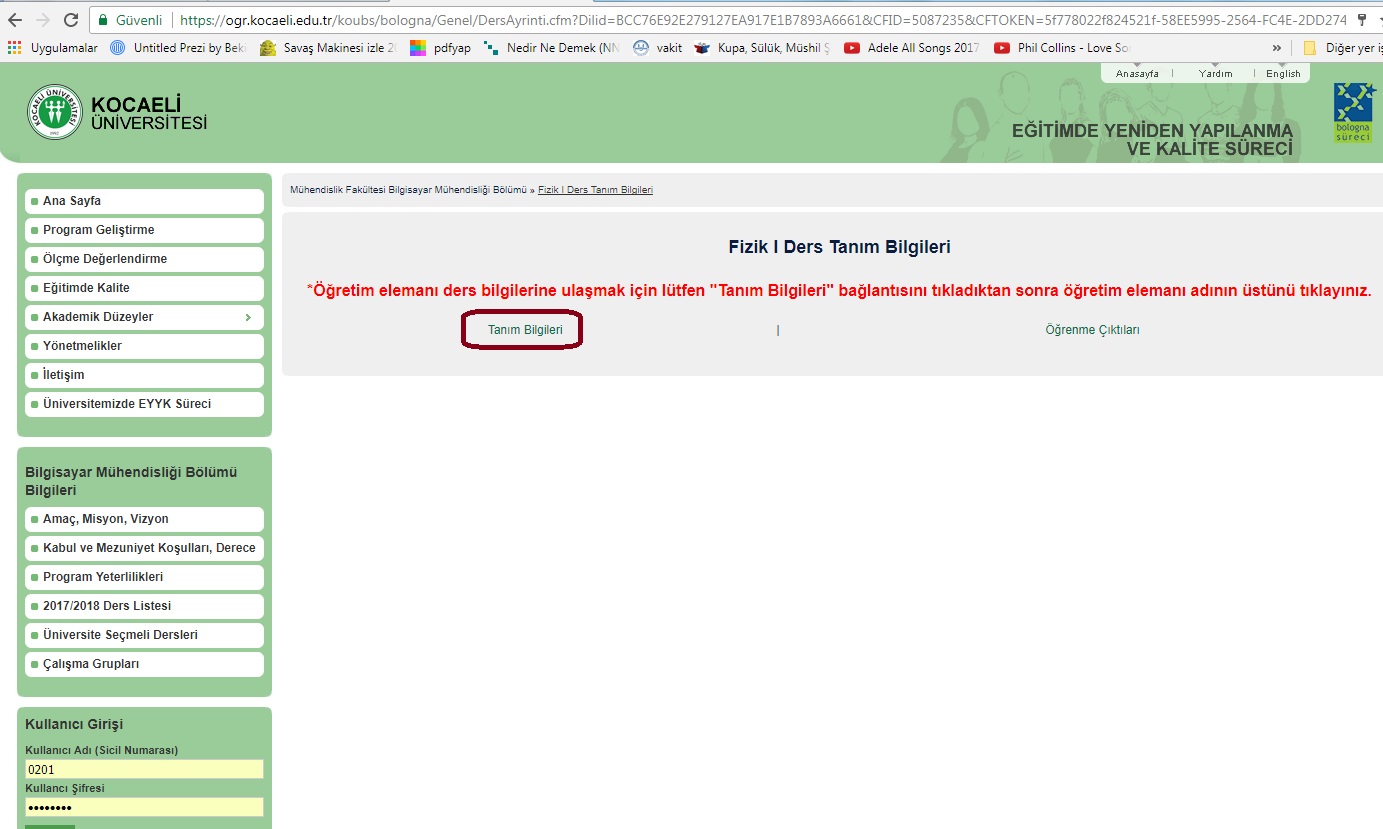 - . "Tanım Bilgileri" seçilirse Ders İçeriklerine ulaşılabilir.