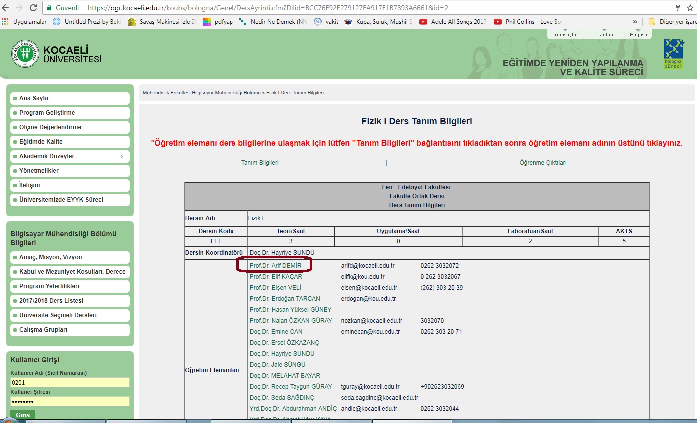 - . Örneğin "Arif Demir" hoca seçilirse Ders İçeriklerine ulaşılabilir.
